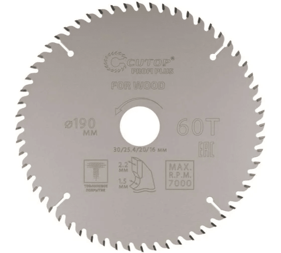 Диск пильный 190*2,2*30/25,4/20/16 60Т по дереву тефлоновое покрытие CUTOP (75-19060Т)