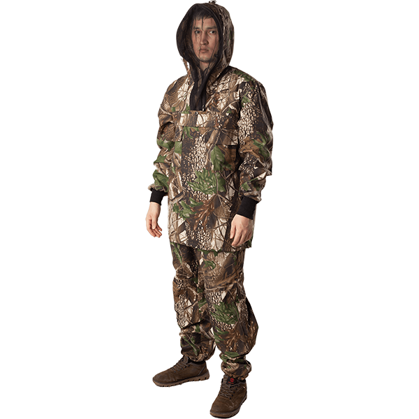 Куртка+брюки. Куртка с капюшоном и противомоскитной сеткой, убираемой в потайной нагрудный карман. На спине и груди дополнительная деталь- "отсекатель" клещей. Низ куртки со шнуром. Рукава с трикотажными манжетами. Брюки с накладными карманами, резинка по низу брюк.